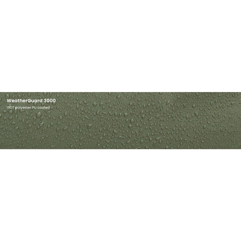 - Fabric: WeatherGuard 3000, 190T polyester PU coated, PFC free water repellency, fire retardant