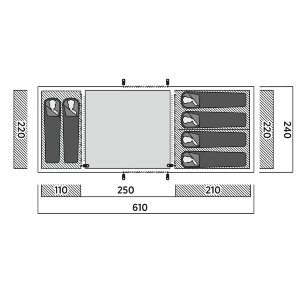 The Leka Twin 6 Vis-à-Vis tent is one of the larger models in the Easy Camp Venture range. It offers sleeping space for up to 6 people, with separate sections at each end, making it the ideal design for bringing friends or older children, providing added privacy. Constructed from lightweight materials, the tent is easy to manage, and the removable groundsheet in the living area helps reduce its packed size. It’s an ideal base camp for your outdoor adventures. Simple features like inner pockets and lantern hanging points let you personalize the space while keeping your essentials within easy reach. A darkened inner reduces morning light, which helps you have a longer rest.