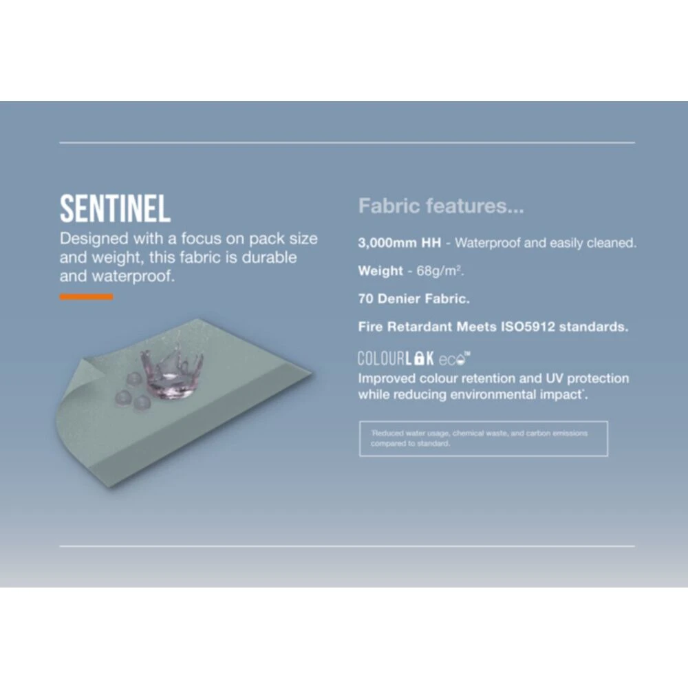 - Fabric: Sentinel Active 70 Denier Polyester Fabric, 3000mm